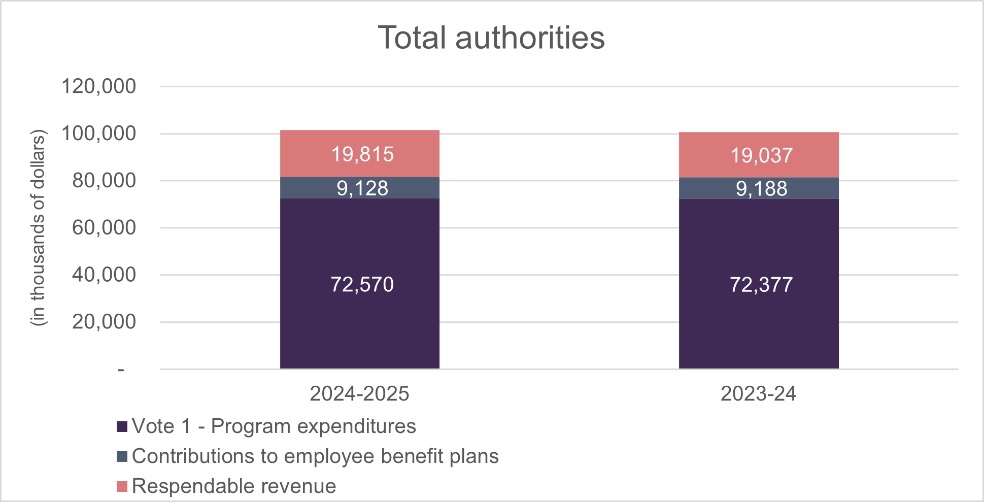 Total authorities available for use in 2024-2025 increased by $0.9 million or 1% in comparison to the $100.6 million available in fiscal year 2023-2024. The variance is mainly due to an increase of $0.2 million in voted appropriation and $0.7 million for revenue brought forward from the previous fiscal year under the provisions of section 18(2) of the Canada School of Public Service Act.
