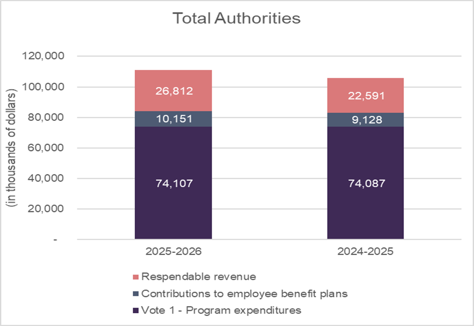 Total authorities available for use in fiscal year 2025-2026 increased by $5.3 million or 5% in comparison to the $105.8 million available in fiscal year 2024-2025. The variance is mainly due to an increase of $0.9 million in legislative authorities related to respendable revenue, $1.0 million for employee benefit plans, and $3.4 million for revenue brought forward from the previous fiscal year.