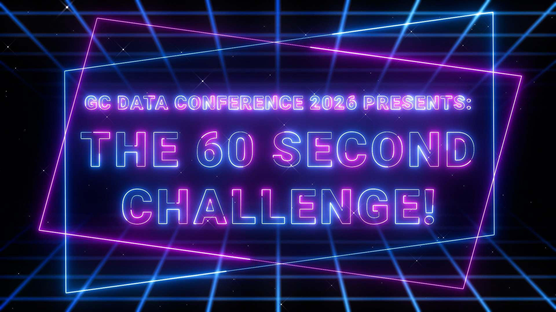 [00:00:00 The video opens with an animated title page. A dark, futuristic background with neon pink and blue lines. Text on screen: GC Data Conference 2026 presents: The 60 Second Challenge!]