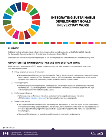 - When developing funding programs, where possible, link program objectives and expected outcomes to the relevant SDGs to highlight how federal investments advance sustainable development and align with Canada's commitment to the 2030 Agenda.