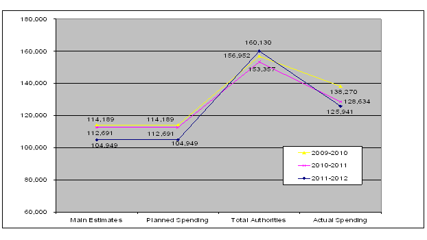** Total authorities, as presented in the "2011-12 Financial Resources" table (and other relevant tables) in the "Summary of Performance" section, is the net of any transfers to SSC. Actual spending does not include expenditures incurred on behalf of SSC as of the OIC date."
