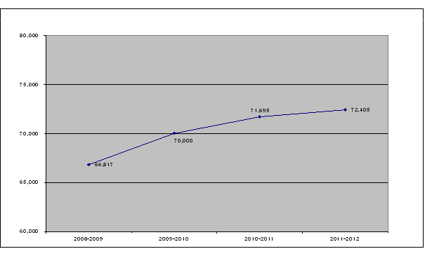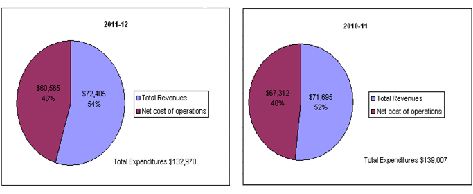 In 2011-2012 total expenditures were $132,970; 54 percent or $72,405 was revenues and 46 percent or $60,565 was the net cost of operations.