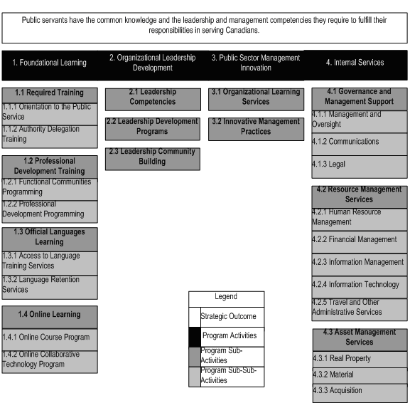 The chart below illustrates the Canada School of Public Service's complete framework of program activities, sub-activities and sub-sub-activities, which roll up and contribute to progress in achieving the strategic outcome.