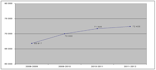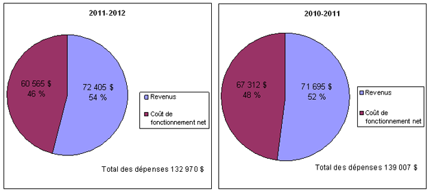 En 2011-2012, le total des dépenses s'élevait à 132 970 $; les revenus représentaient 54 pour cent de cette somme, ou 72 405 $, et le coût de fonctionnement net, 46 pour cent, ou 60 565 $.