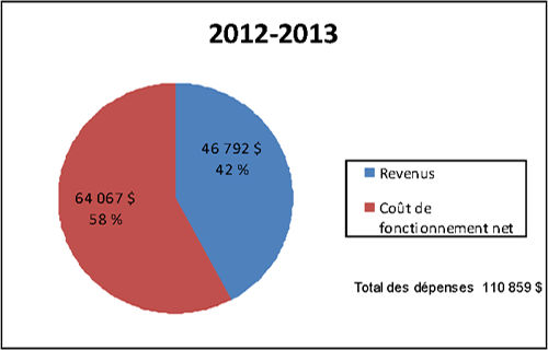La première représente le coût de fonctionnement net (64 067 $ ou 58 %) et la deuxième, le total des revenus (46 792 $ ou 42 %).