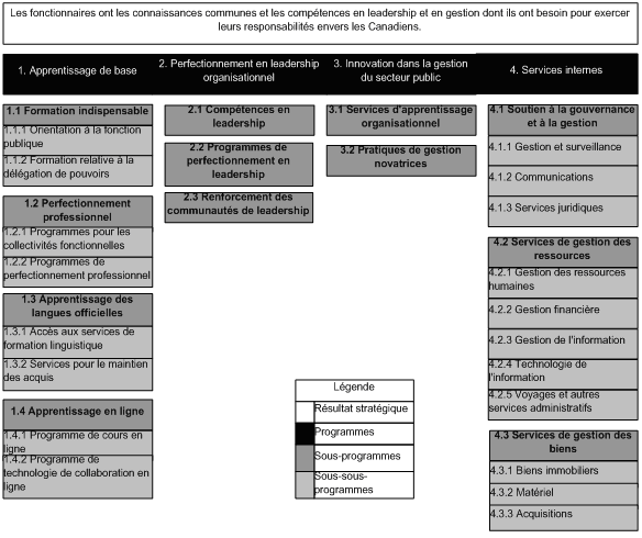 L'École vise un seul résultat stratégique : « Les fonctionnaires ont les connaissances communes et les compétences en leadership et en gestion dont ils ont besoin pour exercer leurs responsabilités envers les Canadiens. » Quatre programmes contribuent à l'atteinte du résultat stratégique :