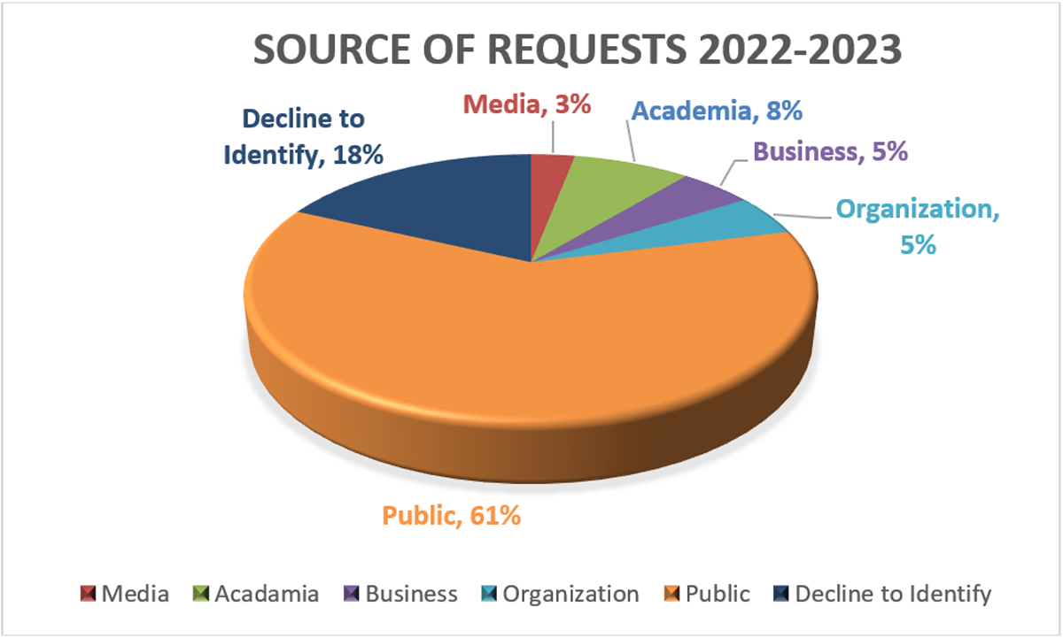 The above pie chart demonstrates the source of requests received in this reporting period (2022-2023).