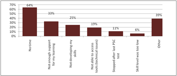 Technical difficulties were identified as a significant challenge impeding participants' effective access to the learning tools. Participants' frustration with the technical difficulties likely contributed to reduced participation and high level of withdrawal from the project. Many more likely discontinued their participation, but did not withdraw formally.