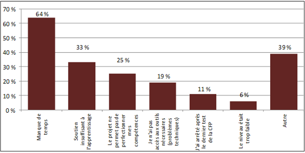 Des difficultés techniques ont toutefois représenté un obstacle considérable à l'accès aux outils d'apprentissage pour les participants. La frustration de ces derniers occasionnée par les difficultés techniques a probablement contribué à la diminution du taux de participation et au taux élevé d'abandon. Il est fort probable que de nombreux participants aient simplement cessé de participer au projet, sans toutefois se désister officiellement.