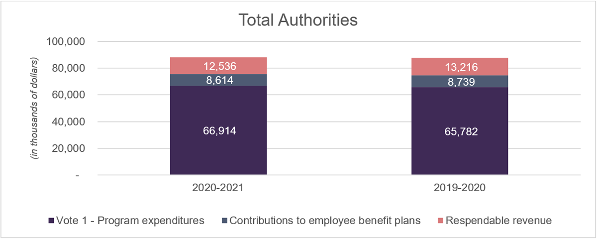 The authorities available for use in fiscal year 2020‑2021 amount to $88.1 million, which comprises $66.9 million in voted appropriations and $21.2 million in statutory funding. Statutory authorities in fiscal year 2020‑2021 consist of $7.6 million of forecasted respendable revenue, $4.9 million of respendable revenue brought forward from the previous fiscal year under the provisions of section 18(2) of the Canada School of Public Service Act, and $8.6 million for employee benefit plans.