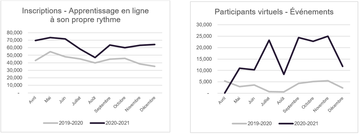 Par rapport au même trimestre en 2019-2020, les inscriptions à l'apprentissage autonome en ligne ont augmenté de 56 % pour atteindre un total de 188 000 au troisième trimestre. Depuis le début de l'année, les inscriptions à l'apprentissage en ligne ont augmenté de 176 000 (44 %), pour un total de 572 000. De plus, au cours du troisième trimestre, le nombre de participants virtuels aux événements a augmenté de 46 000 (352 %). Depuis le début de l'année, le nombre de participants virtuels aux événements a augmenté de 106 000 (342 %).