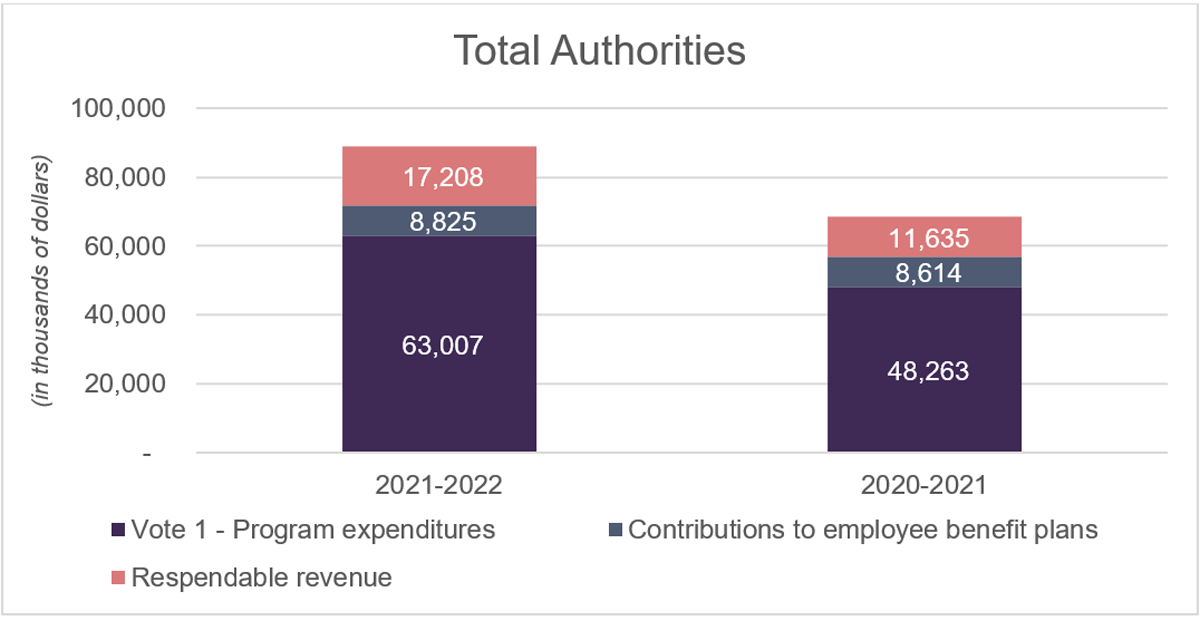 Total authorities available for use in 2021-2022 increased by $20.5 million or 30% in comparison to the $68.5 million available in fiscal year 2020-2021. The variance is mainly due to reduced supply of the Main Estimates in the first quarter of 2020-2021 as a result of the COVID–19 pandemic combined with an increase in forecasted respendable revenue and respendable revenue brought forward in 2021-2022.