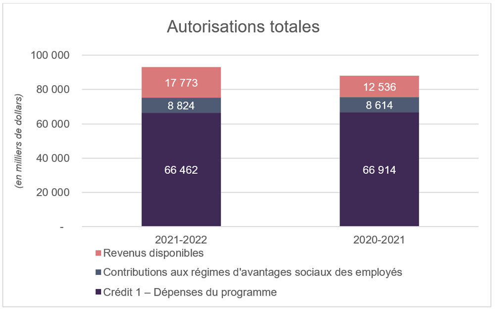 Le total des autorisations disponibles pour 2021-2022 a augmenté de 5,0 millions de dollars ou 6 % par rapport aux 88,1 millions de dollars disponibles pour l'exercice 2020-2021. L'écart est principalement attribuable à un accès accru aux produits et services d'apprentissage de l'École.
