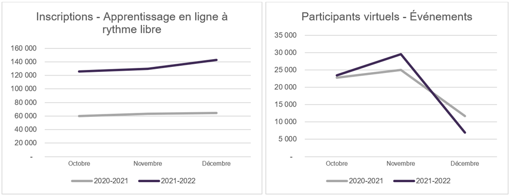 Par rapport au même trimestre en 2020-2021, les inscriptions à l'apprentissage en ligne à rythme libre ont augmenté de 113 % pour atteindre un total de 399 000 au troisième trimestre et le nombre de participants virtuels aux événements est resté stable à un total de 60 000 au troisième trimestre.
