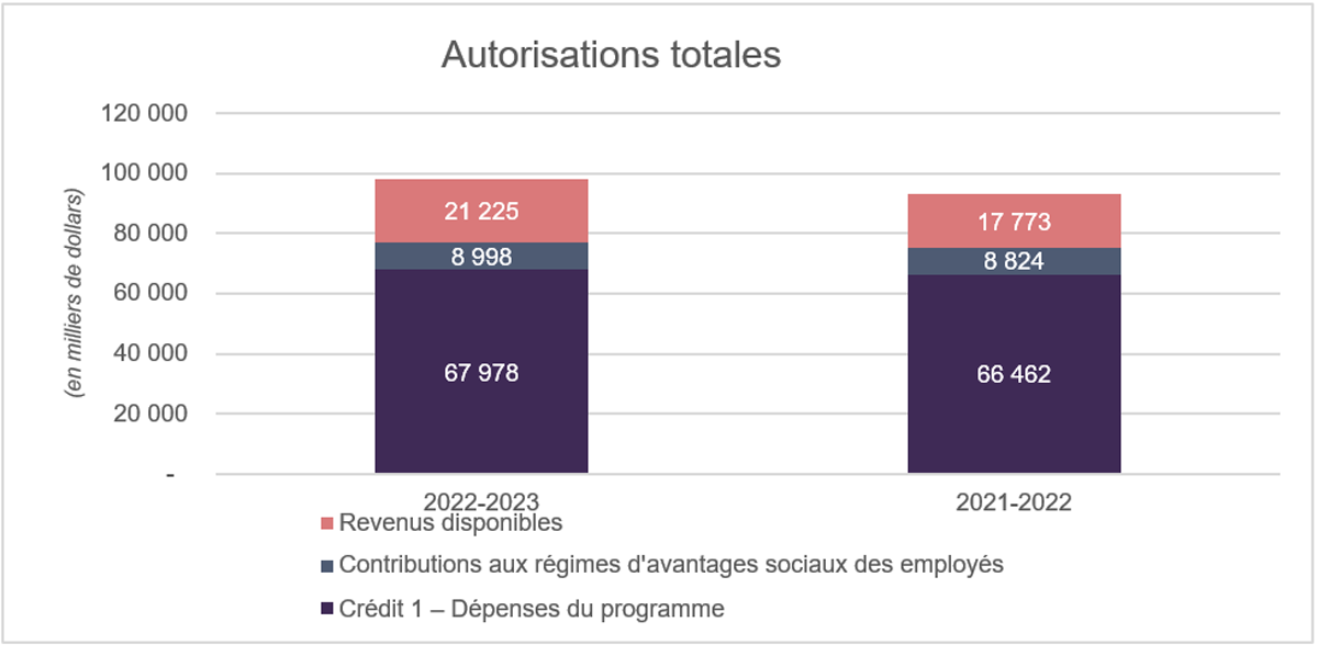 Le total des autorisations disponibles pour 2022-2023 a augmenté de 5,1 millions de dollars ou 6 % par rapport aux 93,1 millions de dollars disponibles pour l'exercice 2021-2022. L'écart est principalement attribuable à une augmentation de 2,7 millions de dollars pour les revenus disponibles reportés de l'exercice précédent, de 1,5 million de dollars pour les crédits votés, de 0,7 million de dollars pour les revenus disponibles prévus et de 0,2 million de dollars pour les régimes d'avantages sociaux des employés.