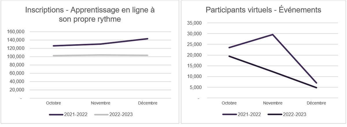Par rapport au même trimestre en 2021-2022, les inscriptions à l'apprentissage en ligne à rythme libre ont diminué de 23 % pour atteindre un total de 308 000 au troisième trimestre et le nombre de participants virtuels aux événements a diminué de 23 000 (-39%), pour un total de 37 000 au troisième trimestre.