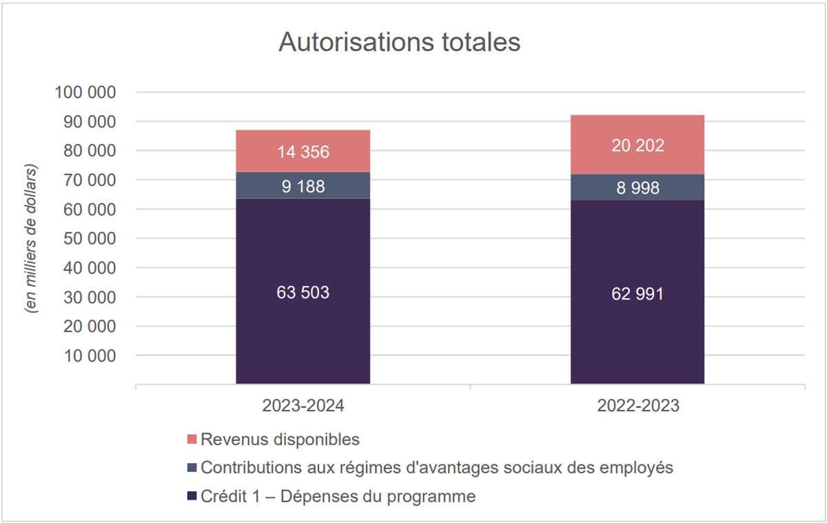 Le total des autorisations disponibles pour 2023-2024 a diminué de 5,1 millions de dollars ou 6% par rapport aux 92,1 millions de dollars disponibles pour l'exercice 2022-2023. L'écart est principalement attribuable à une diminution de 2,7 millions de dollars des revenus disponibles reportés de l'exercice précédent et d'une diminution temporaire de 3,1 millions de dollars en raison d'un décalage dans la perception des revenus compensée par une augmentation de 0,5 million de dollars de crédit voté et de 0,2 million de dollars pour les régimes d'avantages sociaux des employés.