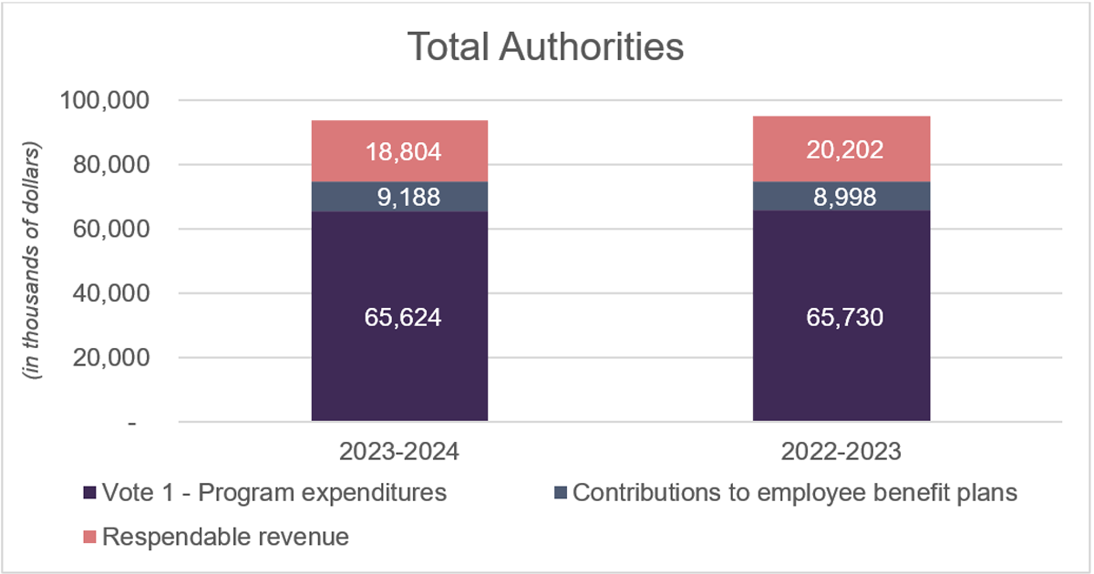 Total authorities available for use in 2023-2024 decreased by $1.3 million or 1% in comparison to the $94.9 million available in fiscal year 2022-2023. The variance is due to a decrease of $2.7 million of respendable revenue brought forward from the previous fiscal year and $0.1 million in voted appropriation, offset by an increase of $0.2 million for employees benefit plans and $1.3 million related to the timing difference in the collection of revenues.