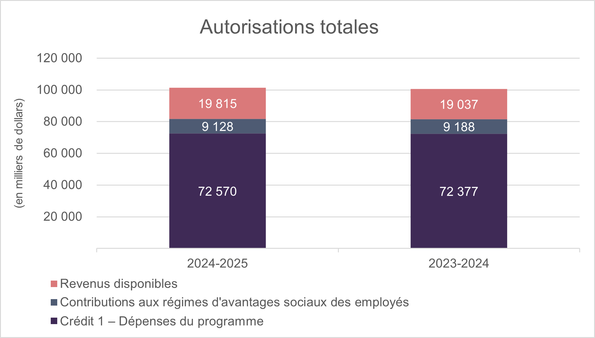 Le total des autorisations disponibles pour 2024‑2025 a augmenté de 0,9 million de dollars ou 1 % par rapport aux 100,6 millions de dollars disponibles pour l'exercice 2023‑2024. L'écart est principalement attribuable à une augmentation de 0,2 million de dollars de crédit voté, et 0,7 million de dollars de revenus reportés de l'exercice précédent en vertu des dispositions du paragraphe 18(2) de la Loi sur l'École de la fonction publique du Canada.