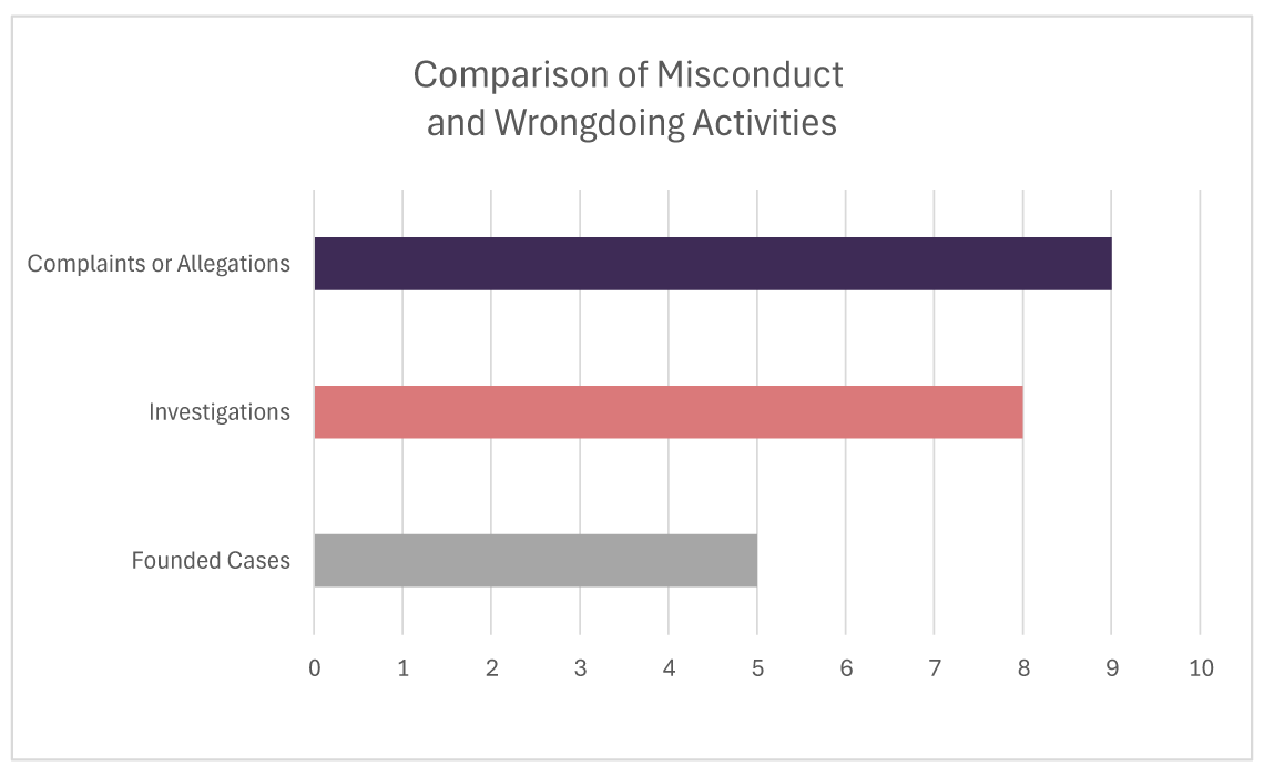 In fiscal year 2024–2025, nine (9) complaints or allegations of misconduct or wrongdoing were brought forward. One (1) case was resolved informally and reported for informational purposes only, and eight (8) cases resulted in internal investigations being launched. Of these, five (5) disciplinary cases were deemed founded and resulted in two (2) written reprimands, two (2) suspensions without pay, and one (1) termination for cause.