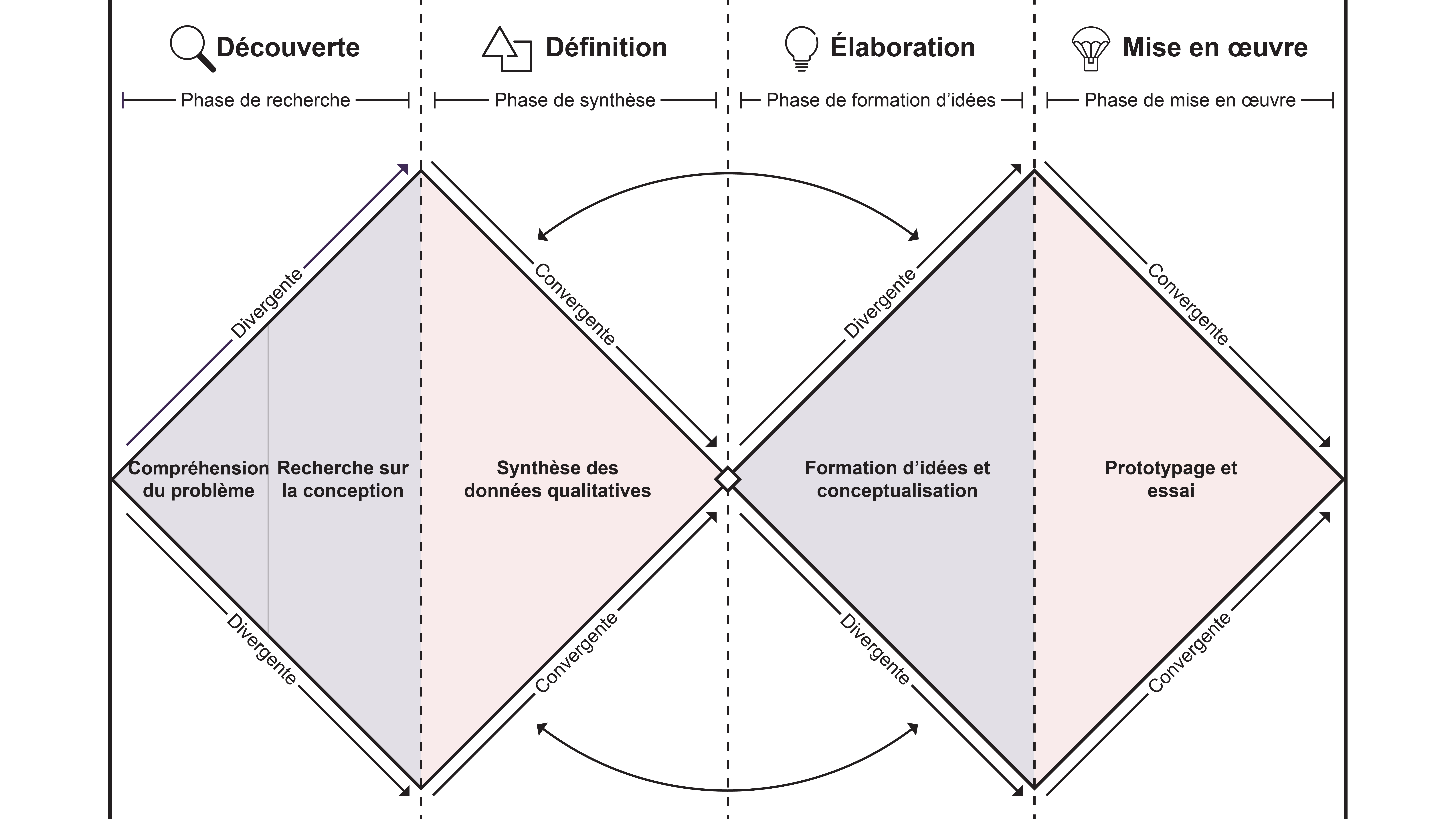 On illustre souvent le processus de conception à l'aide de deux losanges côte à côte. Ceux-ci représentent deux cycles de pensée, divergente, puis convergente, le premier portant sur le problème et son contexte, le second sur la solution.