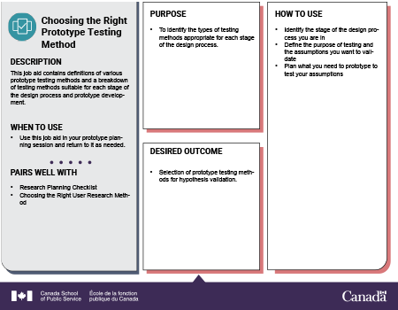 This job aid contains definitions of various prototype testing methods and a breakdown of testing methods suitable for each stage of the design process and prototype development.
