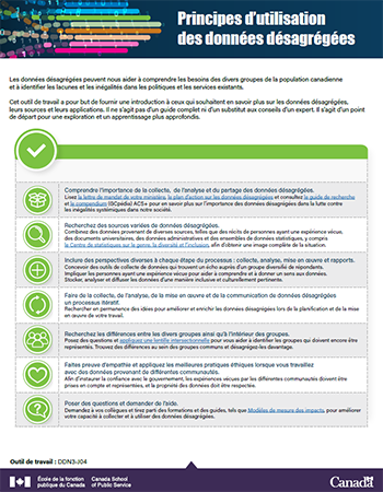Lisez la lettre de mandat de votre ministère, le plan d'action sur les données désagrégées et consultez le guide de recherche et le compendium (PDF) ACS+ pour en savoir plus sur l'importance des données désagrégées dans la lutte contre les inégalités systémiques dans notre société. |