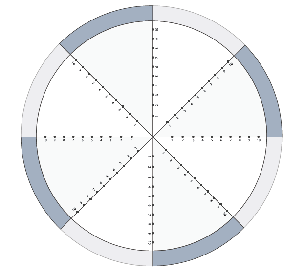 - Indiquez votre degré de satisfaction actuel par rapport à ce domaine (1 = insatisfaction complète, et 10 = satisfaction complète) en reliant les chiffres du segment pour former une part.