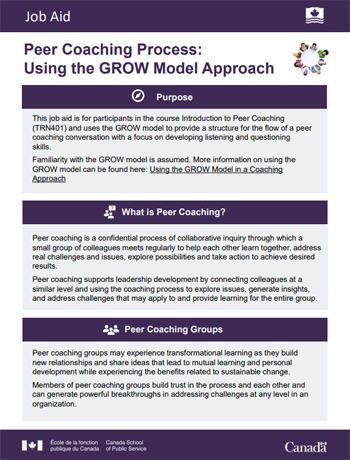 This job aid is for participants in the course Introduction to Peer Coaching (TRN401) and uses the GROW model to provide a structure for the flow of a peer coaching conversation with a focus on developing listening and questioning skills.