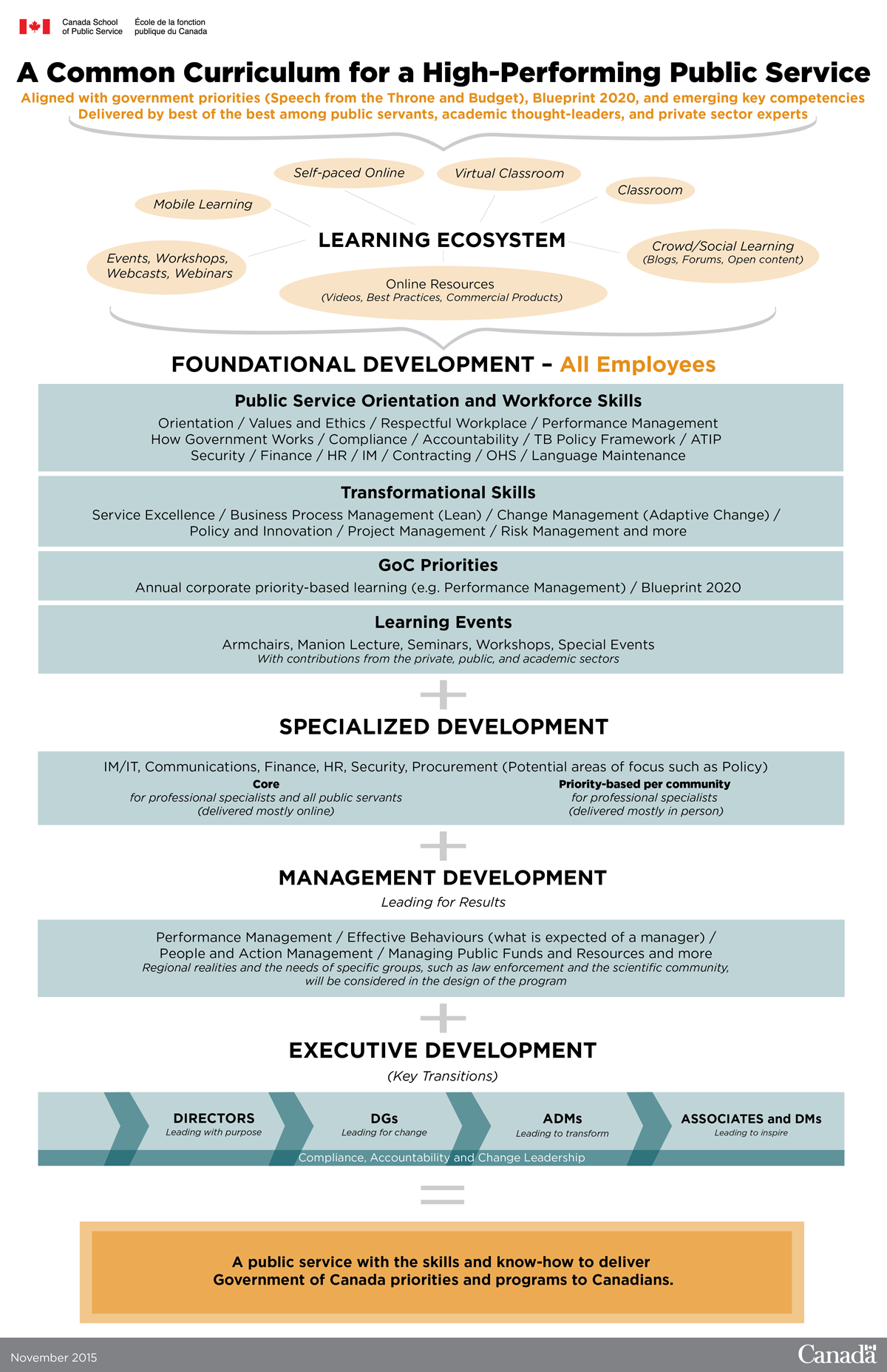 A chart outlining the four levels of the new common curriculum: foundational development (including Public Service Orientation and workforce skills, transformational skills, government priorities, and learning events), specialized development (covering communities such as IM/IT, communications, finance, HR, security and procurement with both core products and priority-based products per community), management development (performance management, effective behaviours, people and action management, managing public funds and more) and executive development (for directors, DGs, ADMs, and associates and DMs). Combined, these products will result in a public service with an increased capacity to deliver Government of Canada priorities and programs to Canadians.
